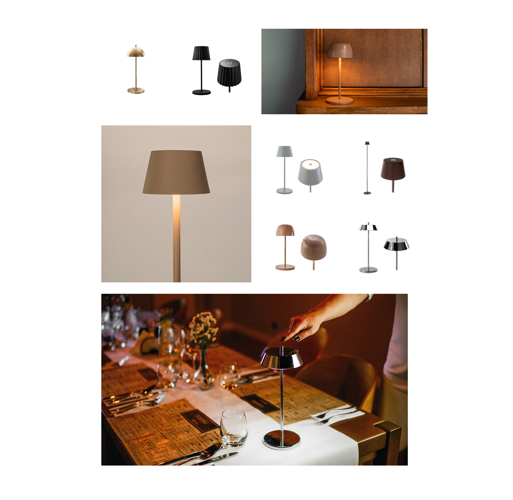 Verlo Tisch- und Stehleuchten sorgen für stimmungsvolles Licht in Restaurants, Hotels und Loungebereichen. Ihr minimalistisches Design, die einstellbare Lichtfarbe und die kabellose Bedienung machen sie praktisch, tragbar und feuchtigkeitsbeständig – ideal auch für Gärten und Terrassen.